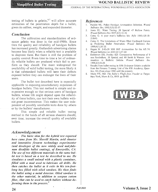 and innovative firearm technology experimenter (and developer of the now widely used molybdenum disulfide bullet coating), of Emeryville, CA. The use of two different materials in the same bullet test is based on a test he described to me. He simulates a small animal with a plastic container, filled with a mud used to lubricate oil drills. He then catches the bullet as it exits in hs ten-foot-long box filled with oiled sawdust. He then finds the bullet using a metal detector. Oiled sawdust is te other material, in addition to unspun cotton fiber, that can be used to catch bullets without deforming them in the process.